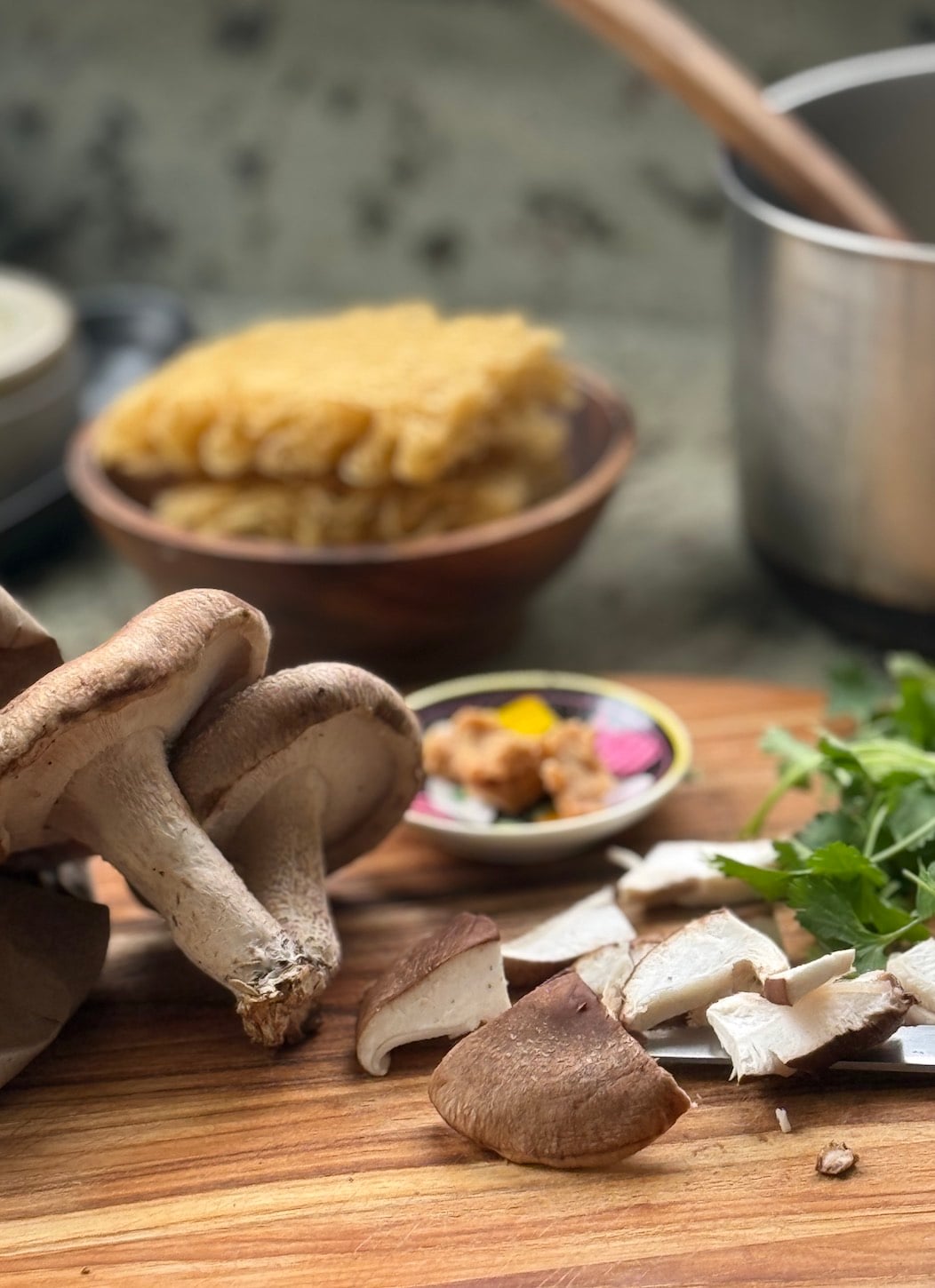 - Drop in cook method – raw sliced mushrooms cook wonderfully when dropped into a soup. Enoki mushrooms are a favorite for this application by dropping them into ramen or broth soup right at the end so they stay slightly crisp, but add their delicate bite (they are a thin mushroom).